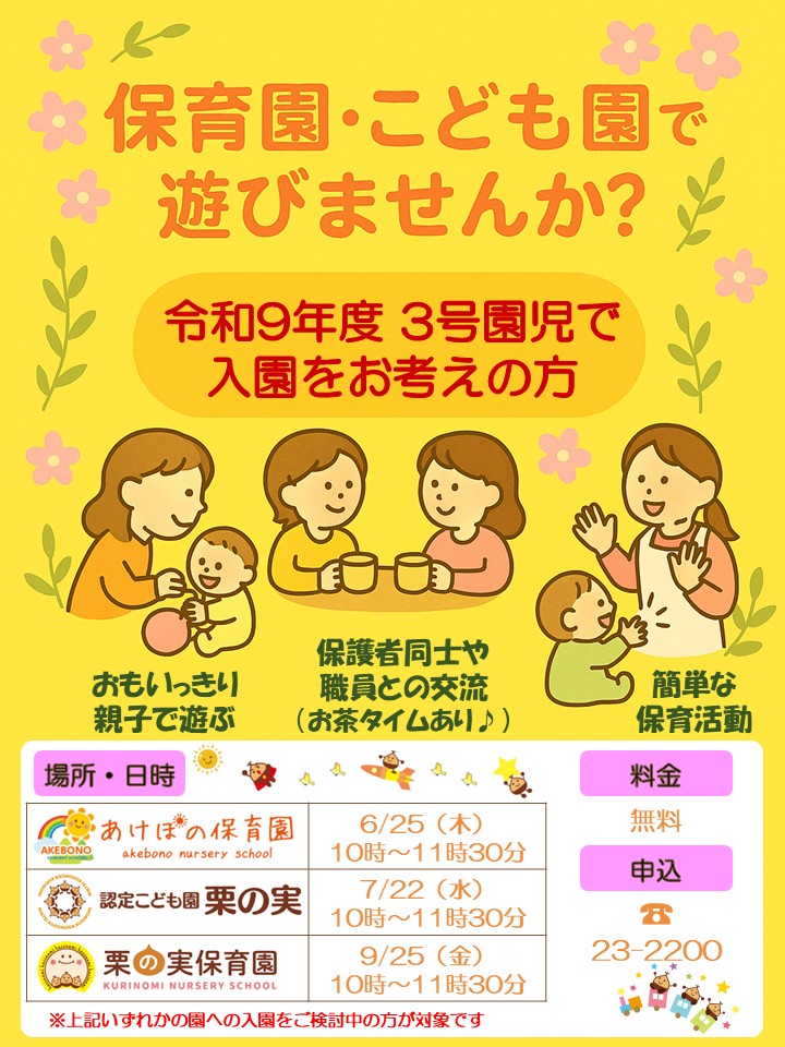令和9年度、3号認定での入園をお考えの方を対象に、保育園の園開放イベントを開催します。